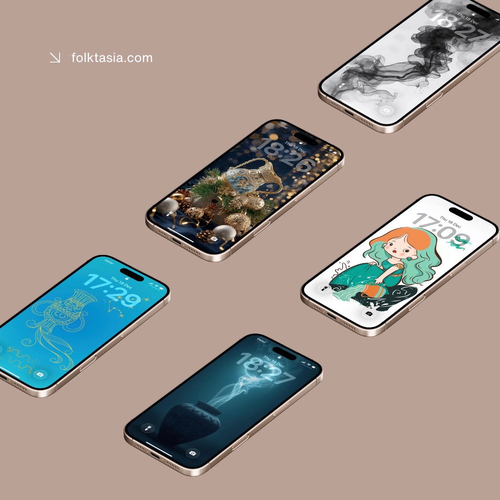 Celebrate Aquarius Season with Premium Digital Art Embrace the visionary and independent energy of Aquarius with this exclusive five-piece wallpaper bundle. This collection is curated to offer a variety of visual experiences, from festive luxury to minimalist fine art, reflecting the unique and innovative personality of the Water Bearer.